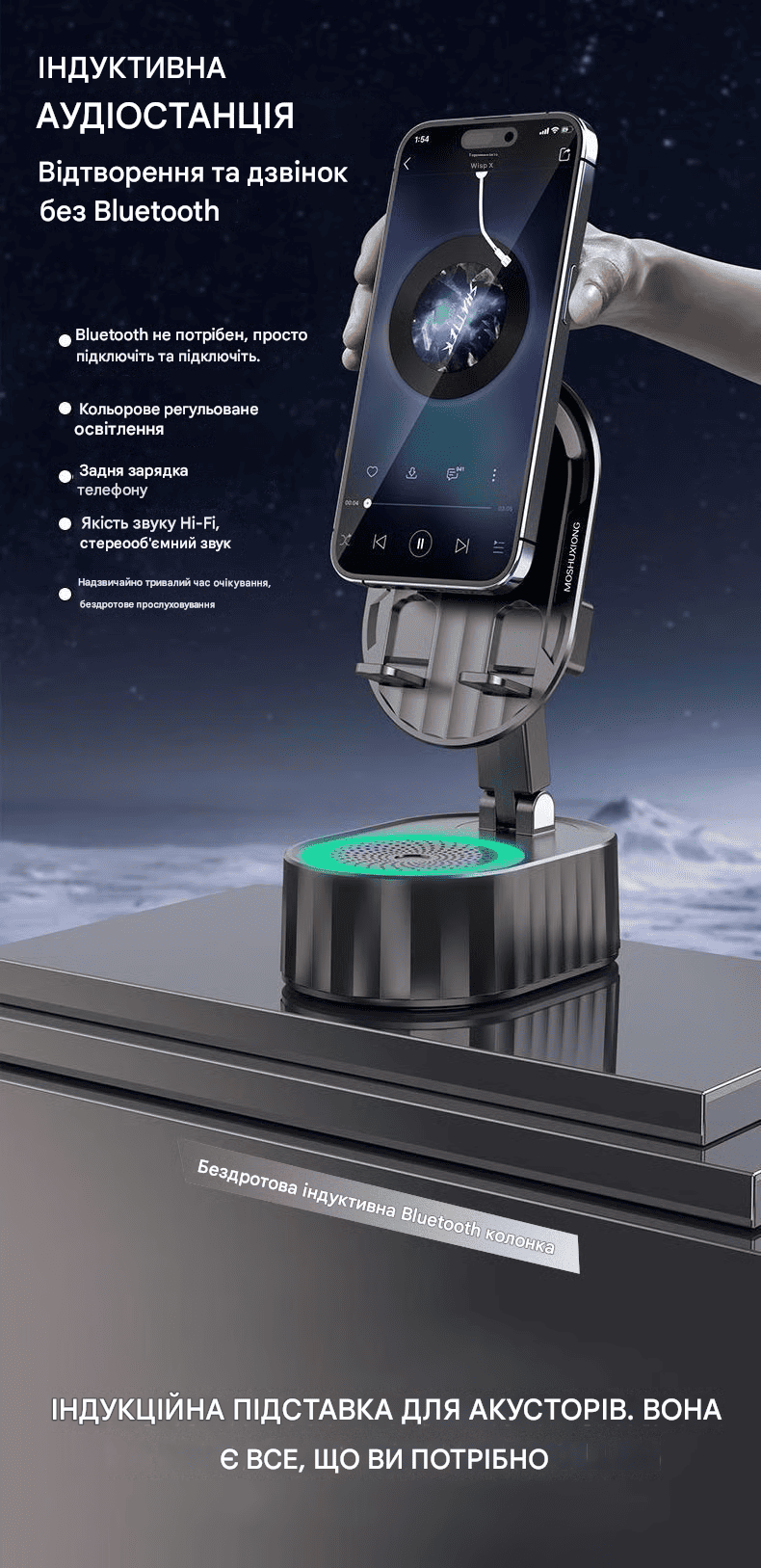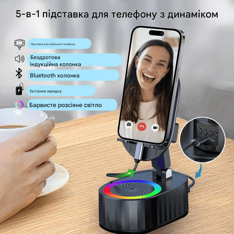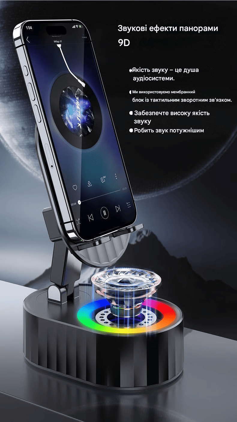 Він складний, легко транспортується та займає мало місця. Кріплення для динаміка і основа тримача для телефону повністю покриті силіконом, що не ковзає, що забезпечує максимальний захист вашого пристрою від подряпин і ковзання.