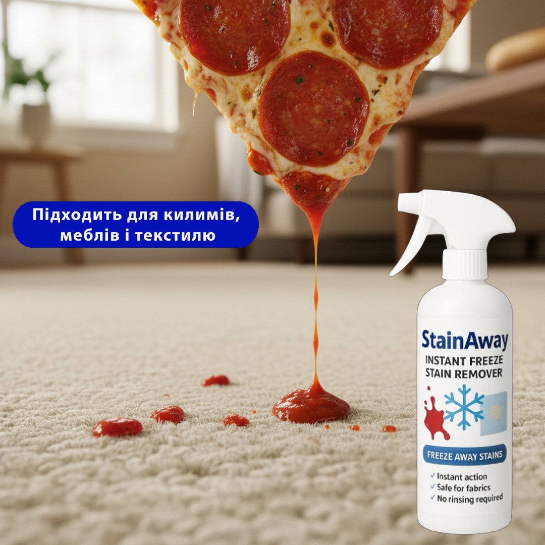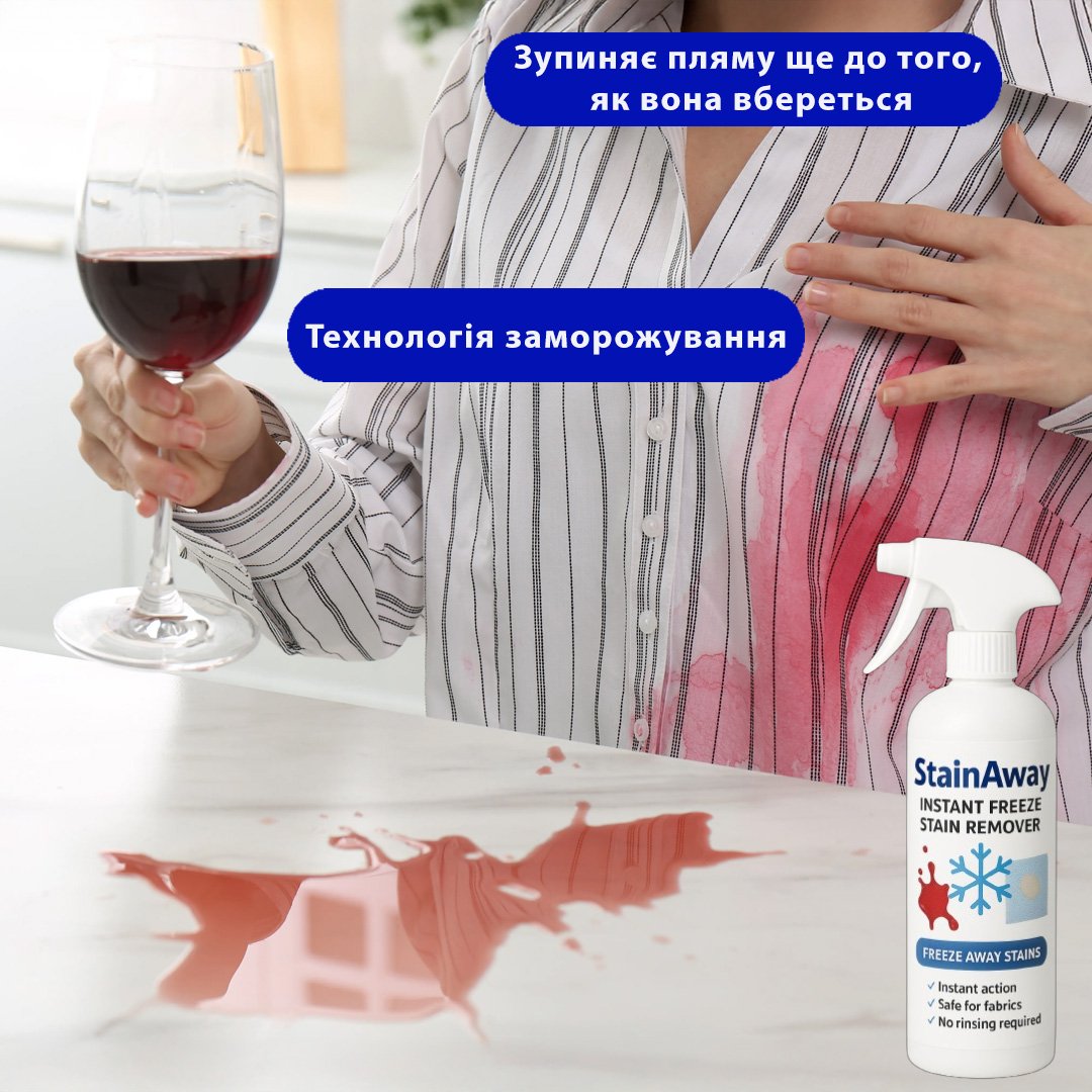 StainAway – Instant Freeze Stain Remover — інноваційний аерозоль, який миттєво видаляє свіжі плями від вина, кави, крові, соків чи соусів з тканин, килимів та оббивки. Формула-заморозка діє за секунди, не даючи плямі вбратися у волокна — без води, без прання.