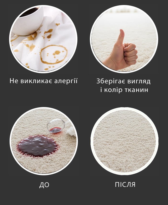 ⚡️ Миттєва дія • 🧊 Делікатно для тканин • 🛋 Підходить для дому та авто • 🌿 Не викликає алергій, без різкого запаху • 💎 Зберігає колір і структуру матеріалу